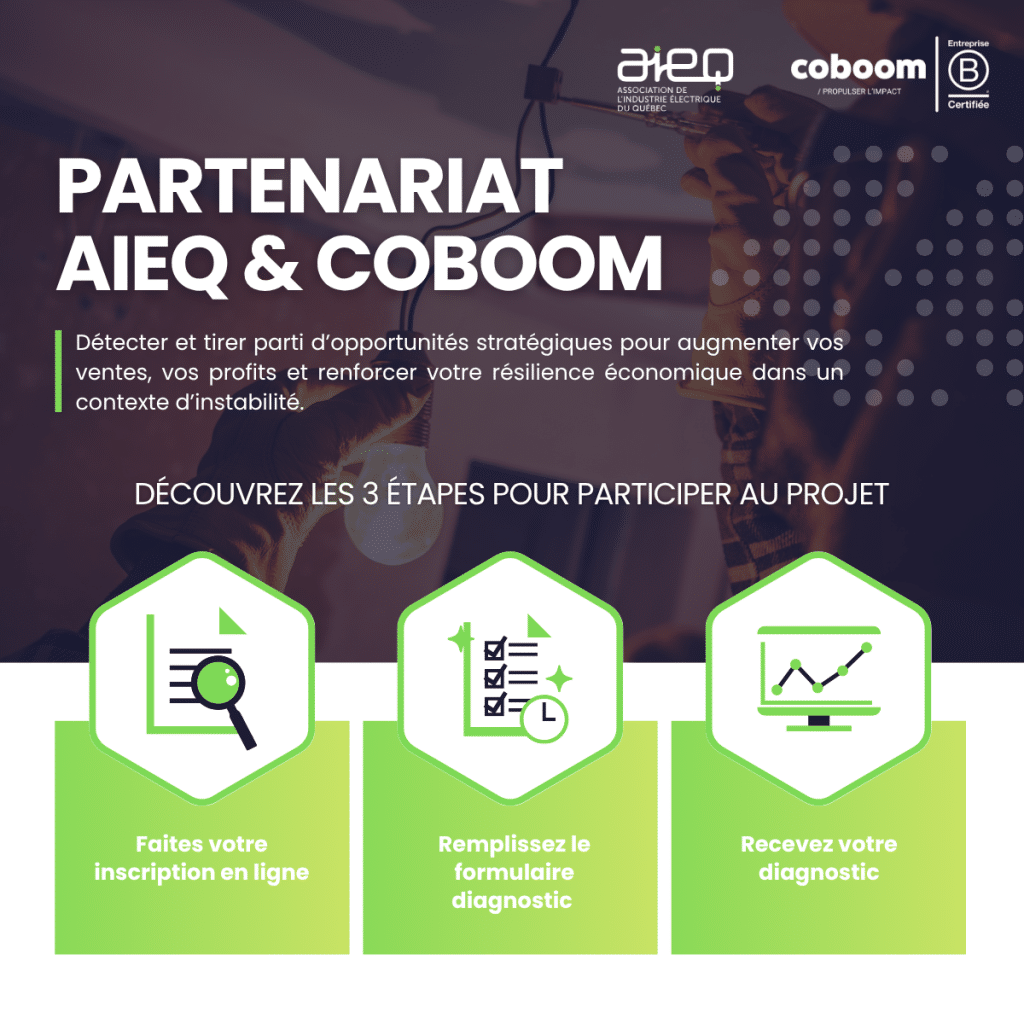 Quels sont les critères d’éligibilité spécifiques pour bénéficier de ce partenariat AIEQ-Coboom ? Ce partenariat s’adresse aux PME et OBNL membres ou non de AIEQ, peu importe le chiffre d’affaires. L’objectif est d’accompagner les entreprises souhaitant améliorer leur productivité, leur compétitivité et leur résilience face aux défis économiques actuels.